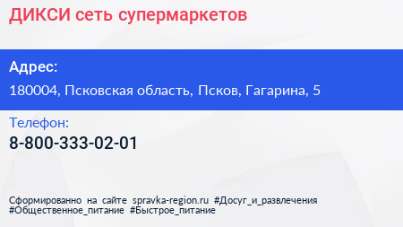 ДИКСИ, сеть супермаркетов по адресу 180004, Псковская область, Псков, Гагарина, 5 в дальнейшем Организация, размещена в следующих категориях: