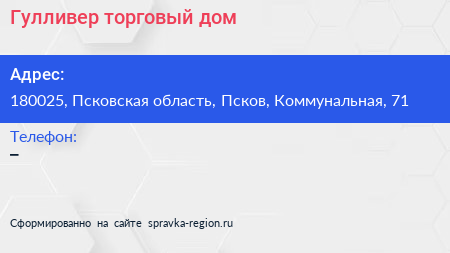 Гулливер, торговый дом по адресу 180025, Псковская область, Псков, Коммунальная, 71 в дальнейшем Организация, размещена в следующих категориях:
