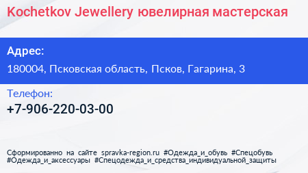 Kochetkov Jewellery, ювелирная мастерская по адресу 180004, Псковская область, Псков, Гагарина, 3 в дальнейшем Организация, размещена в следующих категориях:
