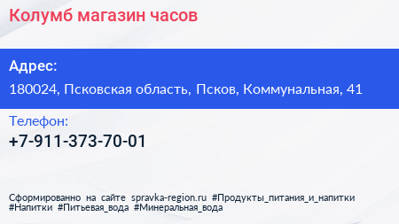 Колумб, магазин часов по адресу 180024, Псковская область, Псков, Коммунальная, 41 в дальнейшем Организация, размещена в следующих категориях: