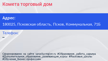 Комета, торговый дом по адресу 180025, Псковская область, Псков, Коммунальная, 71Б в дальнейшем Организация, размещена в следующих категориях: