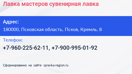 Лавка мастеров, сувенирная лавка по адресу 180000, Псковская область, Псков, Кремль, 8 в дальнейшем Организация, размещена в следующих категориях: