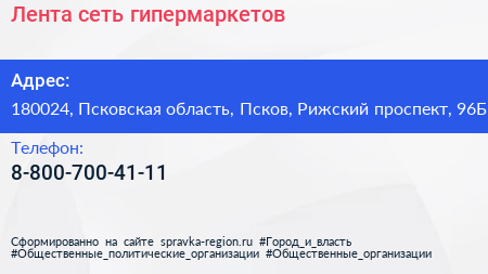 Лента, сеть гипермаркетов по адресу 180024, Псковская область, Псков, Рижский проспект, 96Б в дальнейшем Организация, размещена в следующих категориях:
