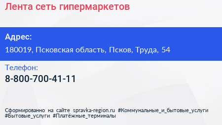 Лента, сеть гипермаркетов по адресу 180019, Псковская область, Псков, Труда, 54 в дальнейшем Организация, размещена в следующих категориях: