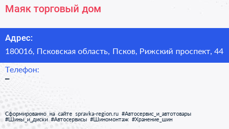 Маяк, торговый дом по адресу 180016, Псковская область, Псков, Рижский проспект, 44 в дальнейшем Организация, размещена в следующих категориях: