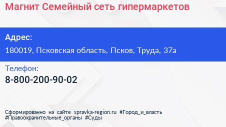 Магнит Семейный, сеть гипермаркетов по адресу 180019, Псковская область, Псков, Труда, 37а в дальнейшем Организация, размещена в следующих категориях: