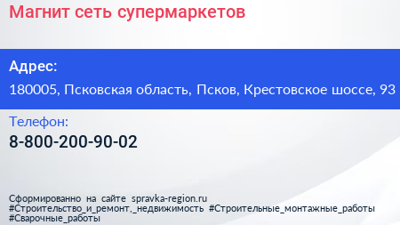 Магнит, сеть супермаркетов по адресу 180005, Псковская область, Псков, Крестовское шоссе, 93 в дальнейшем Организация, размещена в следующих категориях: