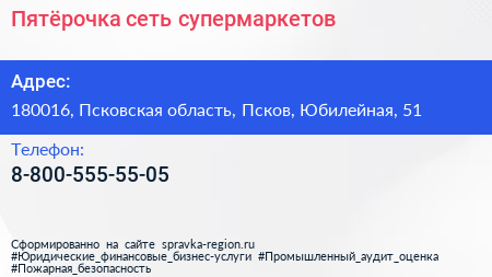 Пятёрочка, сеть супермаркетов по адресу 180016, Псковская область, Псков, Юбилейная, 51 в дальнейшем Организация, размещена в следующих категориях: