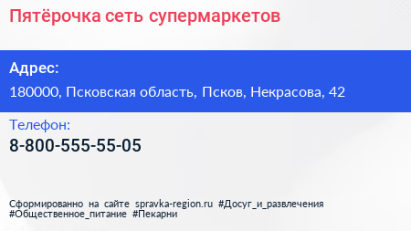Пятёрочка, сеть супермаркетов по адресу 180000, Псковская область, Псков, Некрасова, 42 в дальнейшем Организация, размещена в следующих категориях: