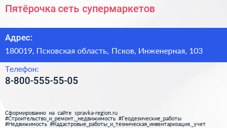 Пятёрочка, сеть супермаркетов по адресу 180019, Псковская область, Псков, Инженерная, 103 в дальнейшем Организация, размещена в следующих категориях: