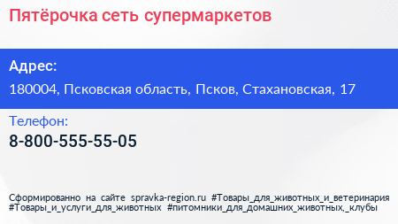 Пятёрочка, сеть супермаркетов по адресу 180004, Псковская область, Псков, Стахановская, 17 в дальнейшем Организация, размещена в следующих категориях: