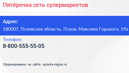 Пятёрочка, сеть супермаркетов по адресу 180007, Псковская область, Псков, Максима Горького, 19а в дальнейшем Организация, размещена в следующих категориях: