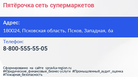 Пятёрочка, сеть супермаркетов по адресу 180024, Псковская область, Псков, Западная, 6а в дальнейшем Организация, размещена в следующих категориях: