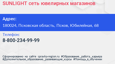 SUNLIGHT, сеть ювелирных магазинов по адресу 180024, Псковская область, Псков, Юбилейная, 68 в дальнейшем Организация, размещена в следующих категориях: