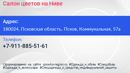 Салон цветов на Ниве по адресу 180024, Псковская область, Псков, Коммунальная, 57а в дальнейшем Организация, размещена в следующих категориях: