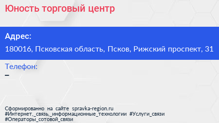 Юность, торговый центр по адресу 180016, Псковская область, Псков, Рижский проспект, 31 в дальнейшем Организация, размещена в следующих категориях: