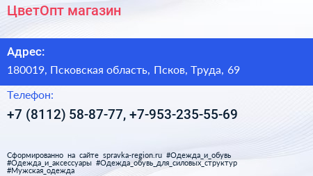 ЦветОпт, магазин по адресу 180019, Псковская область, Псков, Труда, 69 в дальнейшем Организация, размещена в следующих категориях: