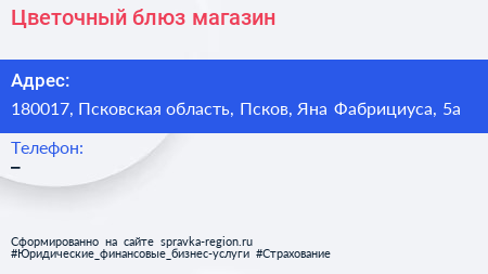 Цветочный блюз, магазин по адресу 180017, Псковская область, Псков, Яна Фабрициуса, 5а в дальнейшем Организация, размещена в следующих категориях: