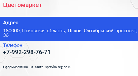 Цветомаркет по адресу 180000, Псковская область, Псков, Октябрьский проспект, 36 в дальнейшем Организация, размещена в следующих категориях: