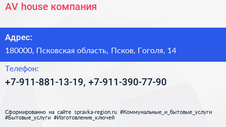 AV-house, компания по адресу 180000, Псковская область, Псков, Гоголя, 14 в дальнейшем Организация, размещена в следующих категориях: