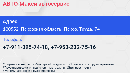 АВТО-Макси, автосервис по адресу 180552, Псковская область, Псков, Труда, 74 в дальнейшем Организация, размещена в следующих категориях: