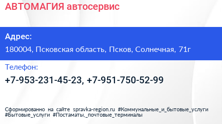 АВТОМАГИЯ, автосервис по адресу 180004, Псковская область, Псков, Солнечная, 71г в дальнейшем Организация, размещена в следующих категориях:
