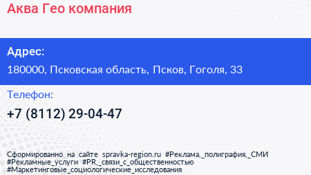 Аква Гео, компания по адресу 180000, Псковская область, Псков, Гоголя, 33 в дальнейшем Организация, размещена в следующих категориях: