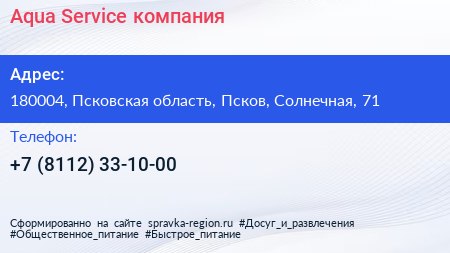 Aqua-Service, компания по адресу 180004, Псковская область, Псков, Солнечная, 71 в дальнейшем Организация, размещена в следующих категориях: