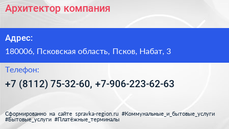 Архитектор, компания по адресу 180006, Псковская область, Псков, Набат, 3 в дальнейшем Организация, размещена в следующих категориях: