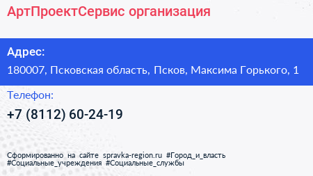 АртПроектСервис, организация по адресу 180007, Псковская область, Псков, Максима Горького, 1 в дальнейшем Организация, размещена в следующих категориях: