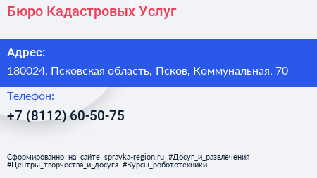 Бюро Кадастровых Услуг по адресу 180024, Псковская область, Псков, Коммунальная, 70 в дальнейшем Организация, размещена в следующих категориях: