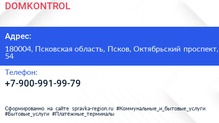 DOMKONTROL по адресу 180004, Псковская область, Псков, Октябрьский проспект, 54 в дальнейшем Организация, размещена в следующих категориях: