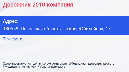 Дорожник-2010, компания по адресу 180559, Псковская область, Псков, Юбилейная, 17 в дальнейшем Организация, размещена в следующих категориях: