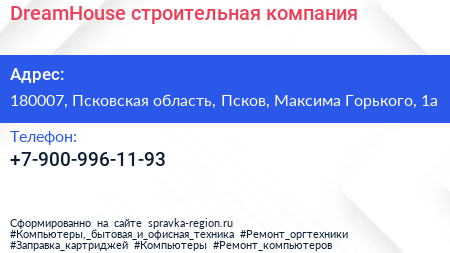 DreamHouse, строительная компания по адресу 180007, Псковская область, Псков, Максима Горького, 1а в дальнейшем Организация, размещена в следующих категориях: