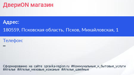 ДвериON, магазин по адресу 180559, Псковская область, Псков, Михайловская, 1 в дальнейшем Организация, размещена в следующих категориях: