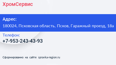 ХромСервис+ по адресу 180024, Псковская область, Псков, Гаражный проезд, 18а в дальнейшем Организация, размещена в следующих категориях: