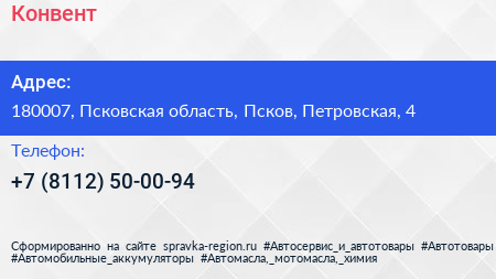 Конвент по адресу 180007, Псковская область, Псков, Петровская, 4 в дальнейшем Организация, размещена в следующих категориях: