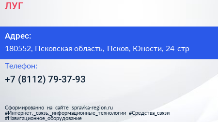ЛУГ по адресу 180552, Псковская область, Псков, Юности, 24 стр в дальнейшем Организация, размещена в следующих категориях: