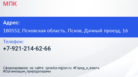 МПК по адресу 180552, Псковская область, Псков, Дачный проезд, 16 в дальнейшем Организация, размещена в следующих категориях: