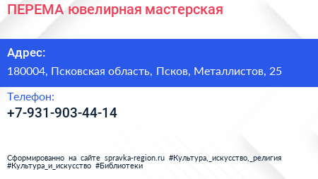 ПЕРЕМА, ювелирная мастерская по адресу 180004, Псковская область, Псков, Металлистов, 25 в дальнейшем Организация, размещена в следующих категориях: