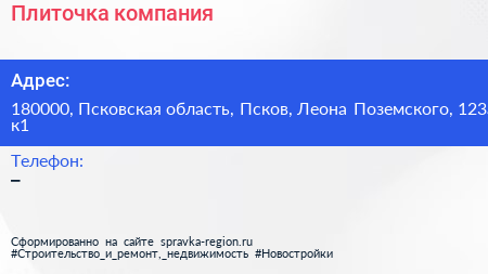 Плиточка, компания по адресу 180000, Псковская область, Псков, Леона Поземского, 123а к1 в дальнейшем Организация, размещена в следующих категориях: