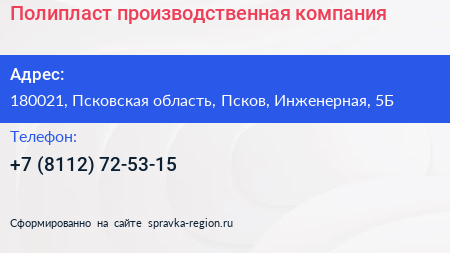 Полипласт, производственная компания по адресу 180021, Псковская область, Псков, Инженерная, 5Б в дальнейшем Организация, размещена в следующих категориях: