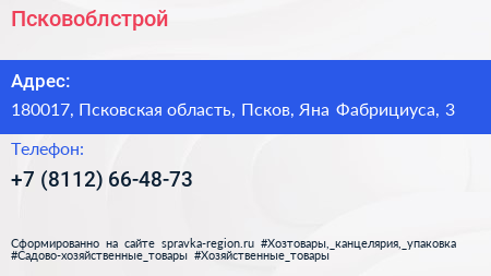 Псковоблстрой по адресу 180017, Псковская область, Псков, Яна Фабрициуса, 3 в дальнейшем Организация, размещена в следующих категориях: