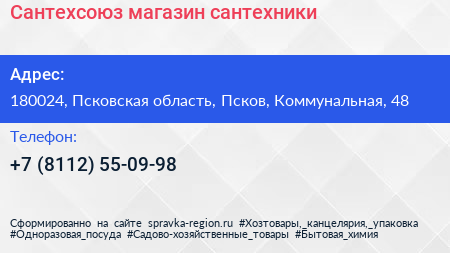 Сантехсоюз, магазин сантехники по адресу 180024, Псковская область, Псков, Коммунальная, 48 в дальнейшем Организация, размещена в следующих категориях: