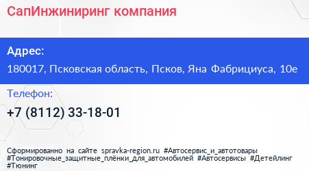СапИнжиниринг, компания по адресу 180017, Псковская область, Псков, Яна Фабрициуса, 10е в дальнейшем Организация, размещена в следующих категориях: