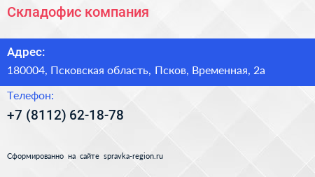 Складофис, компания по адресу 180004, Псковская область, Псков, Временная, 2а в дальнейшем Организация, размещена в следующих категориях: