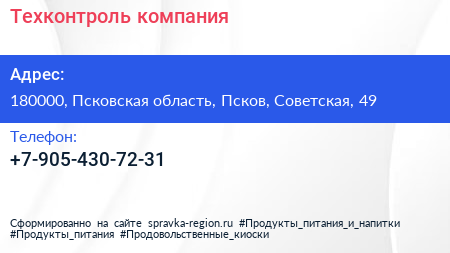 Техконтроль, компания по адресу 180000, Псковская область, Псков, Советская, 49 в дальнейшем Организация, размещена в следующих категориях: