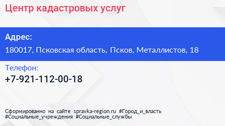 Центр кадастровых услуг по адресу 180017, Псковская область, Псков, Металлистов, 18 в дальнейшем Организация, размещена в следующих категориях:
