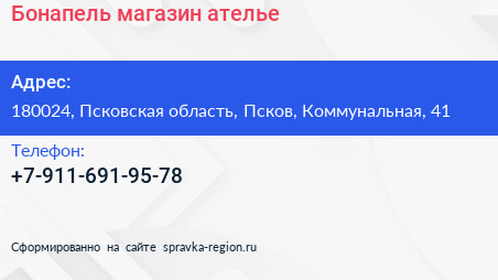 Бонапель, магазин-ателье по адресу 180024, Псковская область, Псков, Коммунальная, 41 в дальнейшем Организация, размещена в следующих категориях: