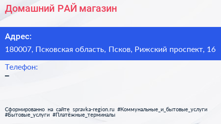 Домашний РАЙ, магазин по адресу 180007, Псковская область, Псков, Рижский проспект, 16 в дальнейшем Организация, размещена в следующих категориях: